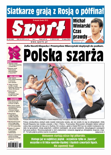 Polscy windsurferzy popłynęli wczoraj znakomicie i wreszcie sięgnęli po olimpijskie, brązowe „krążki”; gdyby nie liczne kontuzje, osiągnąłbym lepszy wynik – podkreślił dzień po starcie Bartłomiej Bonk, sztangista Budowlanych Opole; Piotr Małachowski potwierdził, że należy do czołówki światowej, choć srebrnego medalu z Pekinu nie obronił; Ze zmiennym szczęściem startowały wczoraj polskie załogi – jedynie Beata Mikołajczyk i Karolina Naja popłyną w finale K2 na 500 metrów; trener Andrea Anastasi od początku mówił, że najważniejszy jest drugi tydzień turnieju, a właściwa walka zacznie się w ćwierćfinałach; Śląsk Wrocław nie zagra w koszykarskiej ekstraklasie.