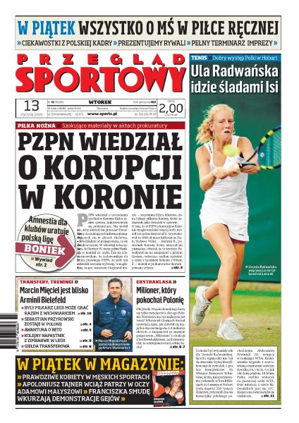 Wokół afery korupcyjnej panowała ogólna zmowa milczenia, sygnały o korupcji w Koronie Kielce dotarły do PZPN trzy lata przed pierwszymi zarzutami; czołowe kluby Ekstraklasy rozpoczęły przygotowania do decydującej fazy walki o mistrzostwo Polski; wywiad z Pawłem Janasem, nowym trenerem Widzewa Łódź; w rundzie jesiennej Marcin Mięciel zagra w ataku Arminii Bielefeld; rozmowa ze Zbigniewem Bońkiem; czy Urszula Radwańska dorówna sukcesami swojej starszej siostrze; rozpoczyna się decydujący etap Rajdu Dakar.