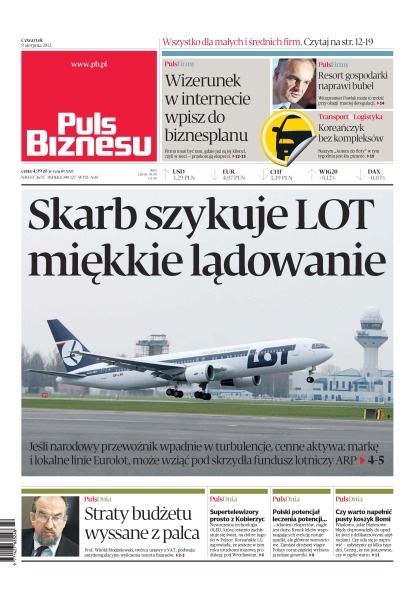 Jeśli LOT wpadnie w turbulencje, cenne aktywa: markę i lokalne linie Eurolot, może wziąć pod skrzydła fundusz lotniczy ARP; prof. Witold Modzelewski, twórca ustawy o VAT, podważa antyderegulacyjne wyliczenia resortu finansów; nowoczesna technologia OLED, którą ostatnio zachłystuje się świat, na dobre zagości w Polsce – koreańskie LG zapowiada, że jeszcze w tym roku uruchomi masową produkcję pod Wrocławiem; rynek leków wspomagających erekcję notuje spadki, ale głównie wartościowe; czy warto napełnić pusty koszyk Bomi.
