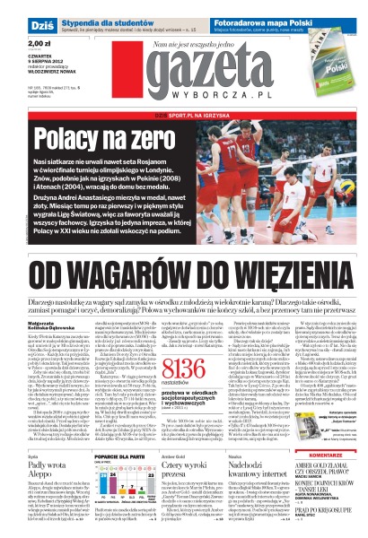 Nasi siatkarze nie urwali nawet seta Rosjanom w ćwierćfinale turnieju olimpijskiego w Londynie – znów, podobnie jak na igrzyskach w Pekinie i Atenach, wracają do domu bez medalu; coraz częściej PiS reprezentują profesorskie, i to kobiece, twarze; rebelianci poddali wczoraj dzielnicę Aleppo, której zaciekle bronili od trzech tygodni – ruszyła decydująca ofensywa; zaskakujący zwrot w sprawie szefów spółki naftowej Jukos: sąd skrócił Płatonowi Lebiediewowi wyrok 13 lat łagru; od jutra wkinach „Dziedzictwo Bourne’a” Tony’ego Gilroya; Chińczycy dokonali kwantowej teleportacji na odległość blisko 100km; kolejny dzień klienci Amber Gold koczowali przed oddziałami firmy z nadzieją na odzyskanie pieniędzy; dziś Usain Bolt chce nie tylko wygrać na 200 m, ale i przejść do historii jeszcze bardziej spektakularnie.