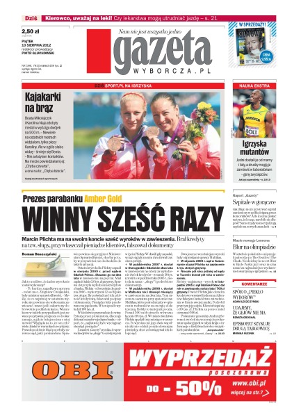 Marcin Plichta ma na swoim koncie sześć wyroków w zawieszeniu – brał kredyty na tzw. słupy, przywłaszczał pieniądze klientów, fałszował dokumenty; ile może przetrwać szpital zamieniony w spółkę ściganą przez komorników; zabójca, który urządził kilka dni temu krwawą jatkę w świątyni sikhów w Wisconsin, grał wcześniej w zespole propagującym wyższość rasy białej; nawet co szósty wypadek drogowy powodują kierowcy po zażyciu leków – często nawet nie zdają sobie sprawy, że nie powinni wtedy prowadzić; jak firmy szykują się na chudsze lata; David Rudisha przebiegł wczoraj 800 m w czasie 1.40,91 i pobił rekord świata.