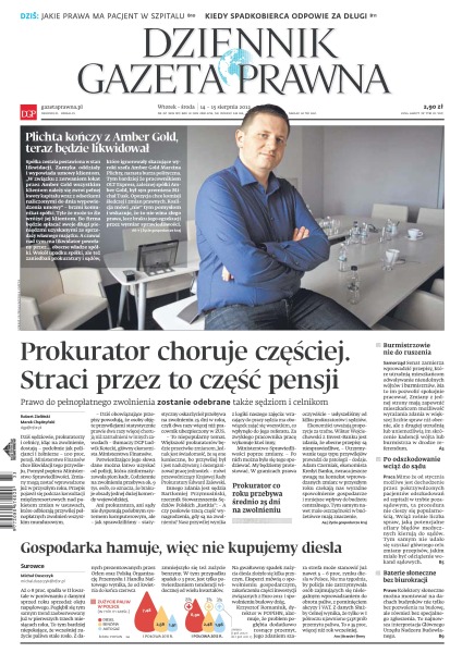 Jakie prawa ma pacjent w szpitalu; Plichta kończy z Amber Gold, teraz będzie likwidował; czy prawo do pełnopłatnego zwolnienia zostanie odebrane także sędziom i celnikom; senat zamierza wprowadzić przepisy, które utrudnią mieszkańcom odwoływanie nieudolnych wójtów i burmistrzów; aż o 8 proc. spadła w II kwartale w porównaniu z danymi sprzed roku sprzedaż oleju napędowego – pogłębił się tym samym trend zaobserwowany już w pierwszych trzech miesiącach roku; kolektory słoneczne można montować na dachach budynków nie tylko bez pozwolenia na budowę, ale również bez specjalnego zgłoszenia; wieś jest młodsza niż miasto i bezpieczniejsza w ciężkich czasach; irlandzkie media przekonują, że Ryanair bierze tyle paliwa, aby tanio latać, a w razie potrzeby wymusić priorytetowe lądowanie.