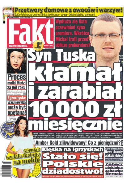 Michał Tusk na łamach Faktu tłumaczy się ze współpracy dla przewoźnika OLT Express; gdański parabank do likwidacji – wieść o tym zaalarmowała klientów; czy proces Waśniewskiej rozpocznie się za pół roku; dlaczego lotnicze pogotowie odmówiło transportu 5-latka z Gostynia do szpitala w Poznaniu; niepełnosprawna pani Emilia została upokorzona w sklepie obuwniczym; Edyta Górniak wzięła się za urządzanie swojej luksusowej willi; sukcesy polskich olimpijczyków nie zrobiły wrażenia, bo odnosili je w sportach niszowych.