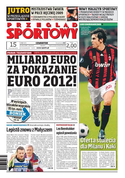 UEFA liczy na rekordowe zyski z transmisji telewizyjnych Euro 2012; Leo Beenhakker i Franciszek Smuda porozumieli się w sprawie powołania piłkarzy Lecha Poznań na najbliższe zgrupowanie reprezentacji; Górnik Zabrze przeznacza na zimowe transfery kolejne dwa miliony złotych; jakie są aktualne priorytety polityki transferowej Legii Warszawa; Adam Małysz rozstanie się z reprezentacją i będzie trenował indywidualnie pod opieką fińskiego trenera; Tomasz Sikora obawia się zawodów w pechowym Ruhpolding; Agnieszka Radwańska odpadła z turnieju w Sydney po ćwierćfinale rozgrywanym w 40-stopniowym upale.