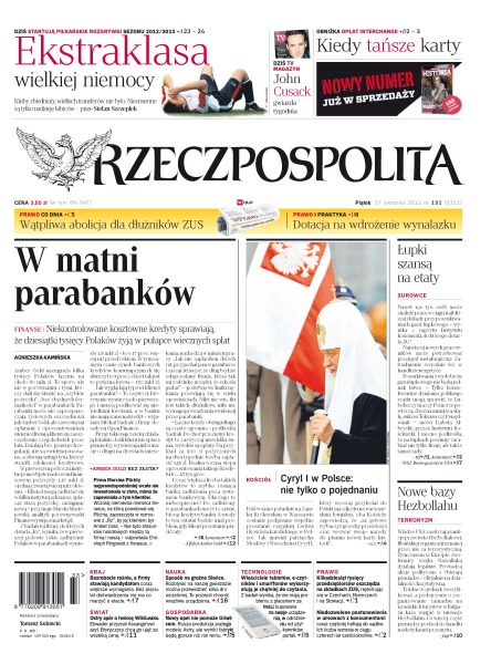 Kościoły Polski i Rosji zapowiedzą we wspólnym przesłaniu, że „są gotowe wybaczyć grzechy przeszłości”; renomowana mennica z Niemiec zaprzecza, by kiedykolwiek handlowała z firmą Marcina Plichty; podczas gdy USA nakładają nowe sankcje na Hezbollah, organizacja bez przeszkód może działać w Europie; spór o twórcę portalu WikiLeaks wywołał poważny kryzys między Londynem a Quito; hybrydy szturmują rynek samochodów; na targu staro ci Panjiayuan jest prawdopodobnie więcej tybetańskich młynków modlitewnych, posążków i malowanych na jedwabiu bóstw niż we wszystkich wioskach Tybetu; dzisiaj zaczynają się rozgrywki ekstraklasy – kluby zbiedniały, znaczących transferów nie było; gaz łupkowy może dać 190 tysięcy miejsc pracy.
