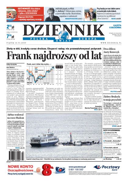 Janusz Palikot, poseł Platformy Obywatelskiej mówi, że sam złoży rezygnację z komisji Przyjazne Państwo; kobiety z PO, SLD i PiS włączą się do akcji walki z rakiem szyjki macicy; trzech uczestników samosądu we Włodowie trafi do więzienia; kurs franka osiągnął rekordowo wysoki poziom, Polacy rozważają przewalutowanie zaciągniętych kredytów; ponad 30 procent dzieci w wieku od 7 do 14 lat posiada własny telefon komórkowy; co zrobić by nie ulec panice w dobie światowego kryzysu finansowego; sobotnie spotkanie premierów Ukrainy i Rosji stwarza szansę na przerwanie gazowego impasu; Airbus 320 lądował awaryjnie na lodowatych wodach rzeki Hudson przy Manhattanie.
