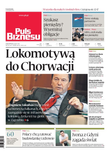 Bankowy kredyt nie zawsze jest najlepszą formą zdobycia kapitału; Chorwaci chcą kupować nad Wisłą opakowania, meble, mięso; brak gotówki nie musi być przeszkodą w podjęciu studiów za granicą; Zbigniew Jakubas ma pomysł na biznes na Bałkanach – jego Newag zaangażuje się w infrastrukturę kolejową; Polacy chcą ratować budowlankę i zdrowie; jak nie przegrać majątku na giełdzie.
