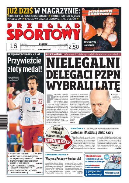 Prokuratura w Olsztynie prowadzi śledztwo, które może spowodować unieważnienie zjazdu wyborczego PZPN; rozmowa z Pietro Leonardim, dyrektorem generalnym Udinese; pomimo powrotu do dobrej formy, Maciej Żurawski nie cieszy się zainteresowaniem ze strony Leo Beenhakkera; Legia Warszawa wzmacnia swój skład przed kolejną rundą Ekstraklasy; Lech Poznań może zarobić na karnetach nawet cztery miliony złotych; w XXI MŚ w piłce ręcznej polska reprezentacja będzie bronić srebrnego medalu.