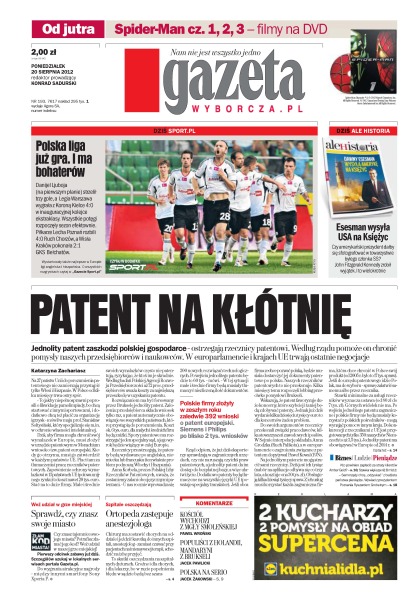 Jednolity patent zaszkodzi polskiej gospodarce – ostrzegają rzecznicy patentowi. według rządu pomoże on chronić pomysły naszych przedsiębiorców i naukowców; kościół wychodzi z mgły smoleńskiej; ortopeda zastępuje anestezjologa; populiści z Holandii, mandarynii z Brukseli; esesman wysyła USA na Księżyc; polska liga piłkarska już gra – i ma nowych bohaterów.