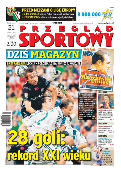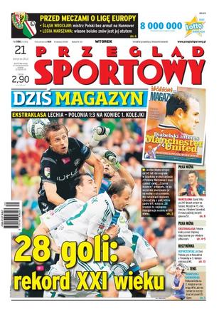 Śląsk Wrocław mistrz Polski bez armat na Hannover a Legia Warszawa własne boisko znów jest jej atutem; David Villa po 247 dniach wrócił na boisko – wszedł w 75. min. meczu z Realem Sociedad, 8 minut później strzelił gola na 5:1; polskie kluby coraz chętniej dają szansę gry młodym piłkarzom; dziś Polska gra w Koszalinie z Finlandią w 3. kolejce eliminacji ME; Agnieszka Radwańska wróciła na 2. miejsce w ran-kingu WTA.