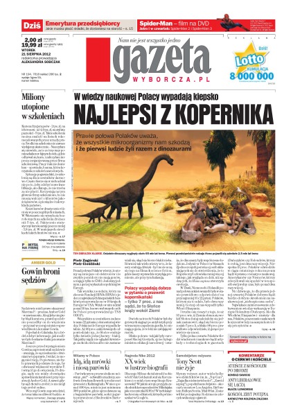 Prawie połowa Polaków uważa, że wszystkie mikroorganizmy nam szkodzą i że pierwsi ludzie żyli razem z dinozaurami; emerytura przedsiębiorcy – jakie musisz płacić składki, ile dostaniesz na starość; XX wiek w lustrze biografii; Tony Scott popełnił samobójstwo – skoczył z mostu w Los Angeles; Gowin broni sędziów w związku ze sprawą Amber Gold; setki tysięcy na ochronę Kaczyńskiego, dziwne umowy w czasie kampanii – jak wyglądają finanse PiS.