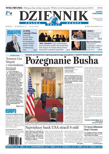 Ostatnie przemówienie George'a W. Busha, najmniej popularnego prezydenta w historii Stanów Zjednoczonych; największy bank USA, gigant finansowy Citigroup stracił 8 mld dolarów; nie doszło do spotkania Radosława Sikorskiego z prezydentem i premier Ukrainy; czy Krzysztof Olszowiec nadal będzie pracował dla Lecha Kaczyńskiego; policjanci CBŚ zatrzymali Roberta P., gangstera odpowiedzialnego za mafijne finanse; polskie szkoły nie przekazują nastolatkom elementarnej wiedzy o seksie; Izrael jeszcze dziś może wstrzymać inwazje w Strefie Gazy.