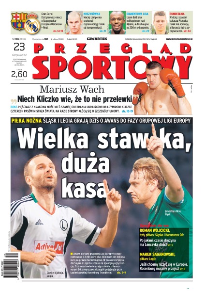 Mariusz Wach może stanąć przed szansą walki o cztery tytuły mistrza świata kategorii ciężkiej – ale na razie najważniejsze są szczegóły kontraktu; dziś pierwszy mecz o Superpuchar Hiszpanii Barcelona– Real; Maciej Lampe ma uratować reprezentację Polski od kompromitacji; Usain Bolt latał helikopterem nad Alpami, a dziś biegnie na 200 m w Lozannie; wyścig z czasem Łukasza Piszczka – Polak ma kontuzję, a Borussia jutro zaczyna sezon.