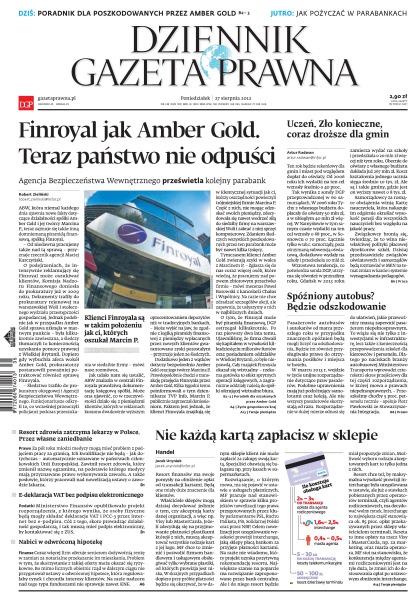 Finroyal jak Amber Gold – teraz państwo nie odpuści – Agencja Bezpieczeństwa Wewnętrznego prześwietla kolejny parabank; uczeń – zło konieczne, coraz droższe dla gmin; spóźniony autobus – będzie odszkodowanie; resort zdrowia zatrzyma lekarzy w Polsce – przez własne zaniedbanie; e-deklaracja VAT bez podpisu elektronicznego; nabici w odwróconą hipotekę.