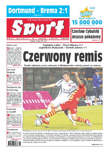 Górnik Zabrze zremisował na wyjeździe z Jagiellonią Białystok, a Zagłębie Lubin po zwycięstwie na własnym boisku nad Piastem Gliwice nie ma już punktów ujemnych; Borussia Dortmund od zwycięstwa nad Werderem Brema zainicjowała kolejny sezon Bundesligi; Waledemar Fornalik ogłosił powołania na mecze eliminacji mistrzostw świata; Rudolf Bugdoł po raz trzeci został prezesem Śląskiego Związku Piłki Nożnej; Lance Armstrong został pozbawiony za doping siedmiu zwycięstw w kolarskim wyścigu Tour de France; w kolejnym turnieju żużlowej Grand Prix obok Tomasza Gollowa pojedzie Krzysztof Kasprzak; w eliminacjach EuroBasketu polscy koszykarze wygrali z reprezentacją Albanii.