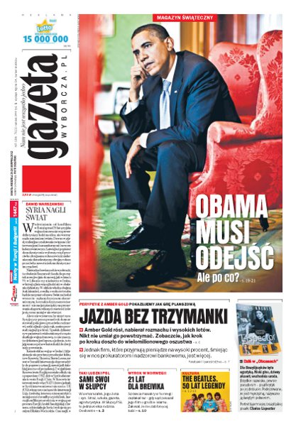 Obama musi odejść, ale po co; jak krok po kroku rozwijał się Amber Gold; 21 lat dla Breivika, sprawcy masakry sprzed roku; sami swoi w Słupcy, czyli jedna wielka rodzina z PSL; 50 lat z The Beatles; rozmowa z Januszem Kapustą, rysownikiem, ilustratorem i architektem; spór o Pussy Riot; telewizja jak Szekspir – rozmowa z wiceprezesem HBO.