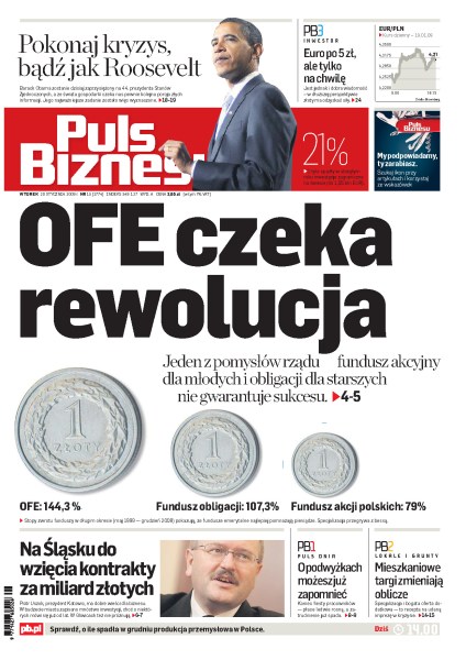 Dziś inauguracja prezydentury Baracka Obamy, rząd proponuje radykalne zmiany w OFE - specjaliści przestrzegają przez dużym ryzykiem, Górny Śląsk inwestuje setki milionów, w walce o „Rzeczpospolitą” pozostało czterech konkurentów, kolejne instytucje obniżają prognozy wzrostu na świecie, ale – zdaniem Komisji Europejskiej – Polskę czeka wzrost PKB o 2%, kurs złotego szuka twardego dna, analitycy dopuszczają nawet 5 zł za euro.