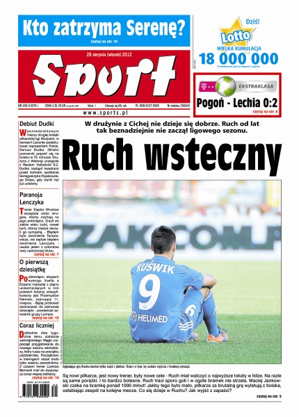 W drużynie z Cichej nie dzieje się dobrze – Ruch od lat tak beznadziejnie nie zaczął ligowego sezonu; w poniedziałkowym meczu drugiej kolejki piłkarskiej ligi Hiszpanii, w barwach Levante zadebiutował reprezentant Polski, Dariusz Dudka; trener Śląska Wrocław wszędzie widzi wrogów, którzy czyhają na jego potknięcia; po dziewięciu etapach wyścigu Vuelta a Espana najwyżej z pięciu uczestniczących w nim polskich kolarzy sklasyfikowany jest Przemysław Niemiec, zajmujący 11. miejsce.