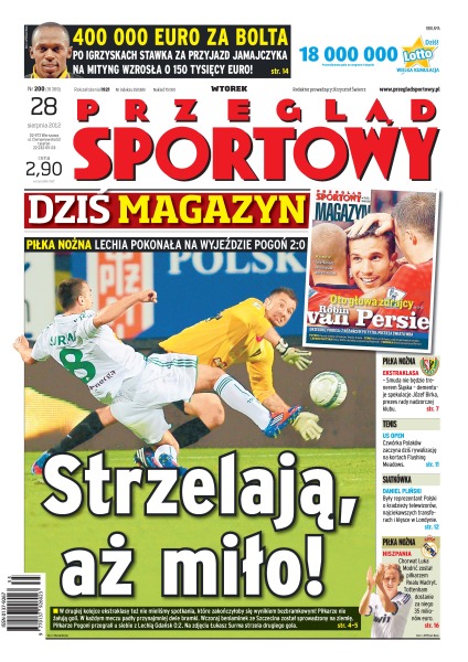 400 000 euro za Bolta – po igrzyskach stawka za przyjazd Jamajczyka na mityng wzrosła o 150 000; w drugiej kolejce ekstraklasy też nie mieliśmy spotkania, które zakończyłoby się wynikiem bezbramkowym – piłkarze nie żałują goli; Smuda nie będzie trenerem Śląska – dementuje spekulacje Józef Birka, prezes rady nadzorczej klubu; czwórka Polaków zaczyna dziś rywalizację na kortach Flushing Meadows; Chorwat Luka Modrić został piłkarzem Realu Madryt – Tottenham dostanie za niego 35 milionów euro.