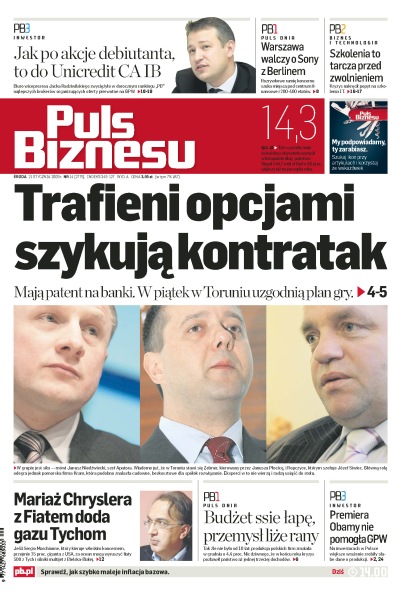Barack Obama przejął stery – rynki wyczekują, w piątek w Toruniu spotkają się przedstawiciele spółek z toksycznymi akcjami, aby ustalić strategię postępowania wobec banków, w IV kwartale kryzys znacząco uszczuplił budżet skarbu państwa, przygotowywany jest obywatelski projekt wprowadzający ulgę w PIT na III filar, Sony Entertainment myśli o otwarciu centrum usług w Warszawie, sojusz Fiata i Chryslera szansą na zarobek dla polskich fabryk, CA IB najlepszy na rynku IPO.