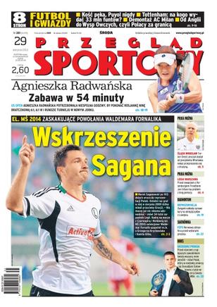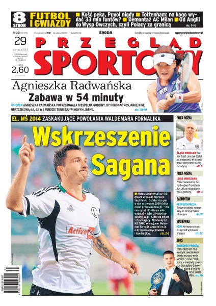 Agnieszka Radwańska wygrała swój jedenasty mecz w karierze w US Open; Marek Saganowski po 1113 dniach wraca do reprezentacji Polski, ostatni raz grał w niej w sierpniu 2009; trener Orest Lenczyk dostał od prezydenta Wrocławia nakaz przeproszenia się z drużyną; przed rewanżem z Rosenborgiem Trondheim Jan Urban ma problem z linią pomocy; związek nakłada surowe kary na olimpijczyków z Londynu.