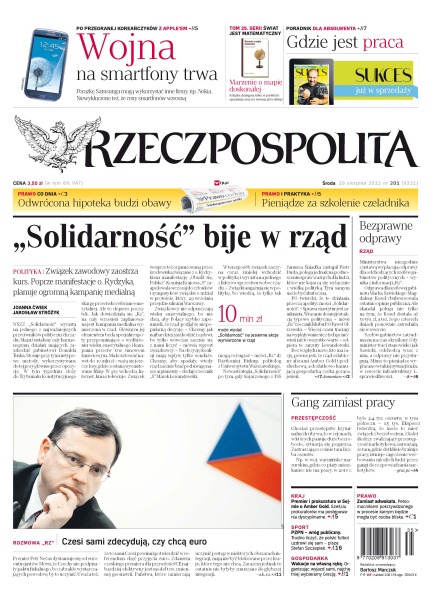 Związek zawodowy zaostrza kurs – poprze manifestacje o. Rydzyka, planuje ogromną kampanię medialną; Czesi sami zdecydują, czy chcą euro; premier i prokuratura w Sejmie o Amber Gold; odwrócona hipoteka budzi obawy; pieniądze za szkolenie czeladnika; porażkę Samsunga mogą wykorzystać inne firmy, np. Nokia – niewykluczone też, że ceny smartfonów wzrosną.