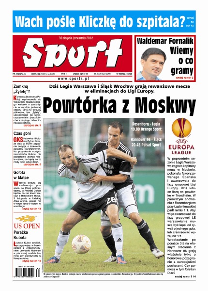 Dziś Legia Warszawa i Śląsk Wrocław grają rewanżowe mecze w eliminacjach do Ligi Europy; czy Wach pośle Kliczkę do szpitala; Komenda Stołeczna Policji wystosowała do Wojewody Mazowieckiego wniosek o zamknięcie w rundzie jesiennej sezonu 2012/13 trybuny północnej, tzw. „Żylety”; GKS Katowice i Polonia Bytom liczą, że dziś w PZPN zapadnie decyzja o zniesieniu zakazów transferowych; wczoraj odbyła się konferencja prasowa, na której potwierdzono, iż Andrzej Gołota będzie po raz trzeci walczył z Riddickiem Bowe.