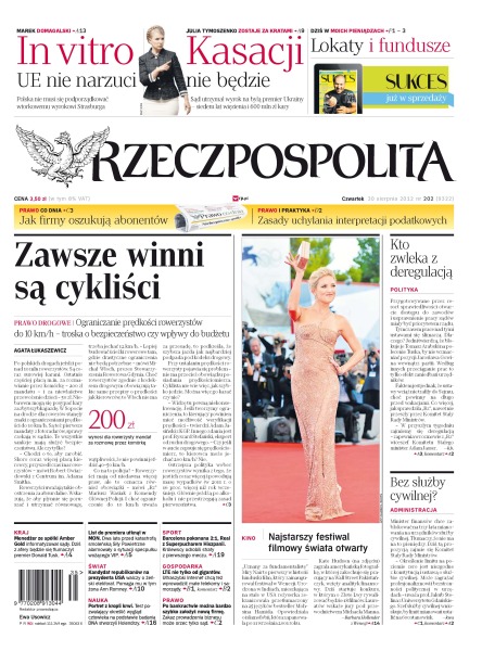 ograniczanie prędkości rowerzystów do 10 km/h –troska o bezpieczeństwo czy wpływy do budżetu; in vitro – Polska nie musi się podporządkować wtorkowemu wyrokowi Strasburga; sąd utrzymał wyrok na byłą premier Ukrainy – siedem lat więzienia i 600 mln zł kary; jak firmy oszukują abonentów; zasady uchylania interpretacji podatkowych; najstarszy festiwal filmowy świata otwarty.