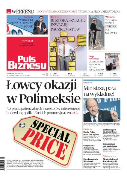 Łowcy okazji w Polimeksie – już pięciu potencjalnych inwestorów interesuje się budowlaną spółką, kusi ich promocyjna cena; Polską markę narodową wyceniono na 472 mld USD – to gigantyczny wzrost – o ponad 200 mld USD w ciągu roku; przedsiębiorcy i eksperci radzą, co zrobić, by ożywić koniunkturę w Polsce i uniknąć twardego lądowania; francuski producent chemii wybuduje w Polsce za 300 mln zł fabrykę krzemionki dla branży motoryzacyjnej; giełdowi giganci dostali zadyszki.