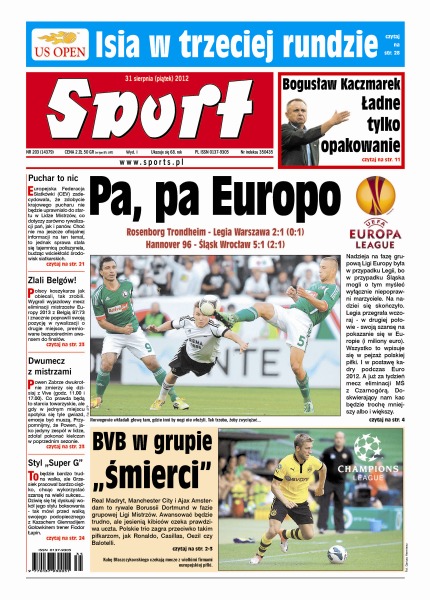 Po dzisiejszym dniu wiadomo, że polskie zespoły nie zagrają w europejskich pucharach – Rosenborg Trondheim - Legia Warszawa 2:1 (0:1)Hannover 96 - Śląsk Wrocław 5:1; Agnieszka Radwańska awansowała do trzeciej rundy wielkoszlemowego turnieju US Open; Real Madryt, Manchester City i Ajax Amsterdam to rywale Borussii Dortmund w fazie grupowej Ligi Mistrzów; polscy koszykarze jak obiecali, tak zrobili – wygrali wyjazdowy mecz eliminacji mistrzostw Europy 2013 z Belgią 87:73.