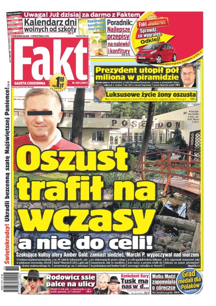 Szokujące kulisy afery Amber Gold: zamiast siedzieć, Marcin P. wypoczywał nad morzem; ile prezydent stracił w piramidzie finansowej; dlaczego Waśniewska nie chodzi na grób córeczki; policja szuka rabusiów, którzy okradli obraz z sanktuarium koło Lidzbarka Warmińskiego; rodzina Krawczyka oskarża Włodarczyk; w odbywających się w Londynie igrzyskach paraolimpijskich nasi niepełnosprawni sportowcy już zdobyli worek medali; lubelski arbiter Paweł Gil nie dał Polonii ewidentnego karnego w meczu z Wisłą, a jeszcze ukarał protestującego trenera stołecznej drużyny Piotra Stokowca; Franciszek Smuda zakończył już kontrakt z PZPN i teraz czeka na potknięcie któregoś z kolegów w lidze; w czwartej rundzie US Open nasza najlepsza tenisistka musi zemścić się na