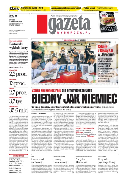 Co trzeci dzisiejszy czterdziestolatek będzie wegetował na emeryturze – to najnowsze szacunki niemieckiego ministerstwa pracy; jak syn Grzeszczaka zarobił na wyborach; polskie dzieci oglądają ponad dwie godziny telewizji dziennie, a naukowcy mówią, że to za dużo – grozi kłopotami w szkole, otyłością, problemami ze snem; ponad 7 tys. nauczycieli może stracić w tym roku pracę; firma krok po kroku: podatki; państwo w przyszłym roku ograniczy inwestycje, nie da budżetówce podwyżek i sięgnie po emerytalne zaskórniaki – tak wynika z projektu budżetu na 2013 r.; Agnieszka Radwańska niespodziewanie odpadła w 1/8 finału US Open z Robertą Vinci; dziś do godz. 17 rozstrzygnie się, czy pierwsze mecze piłkarskiej reprezentacji w eliminacjach MŚ 2014 zobaczymy w ogólnodostępnej telewizji.