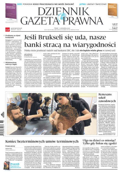 Kogo pracodawca nie może zwolnić; Polska może przekazać nadzór nad bankami EBC, ale i tak nie będzie miała głosu w nowej unii; w czerwcu miał miejsce największy od 2009 r. wzrost udziału złych kredytów w puli kredytów dla dużych przedsiębiorstw; dlaczego resorty finansów i środowiska kłócą się o podział przyszłych wpływów z podatku od wydobycia gazu łupkowego; fryzjerzy, kucharze, mechanicy, lakiernicy, rzemieślnicy – po raz pierwszy od dekady widać wzrost zainteresowania młodzieży tymi profesjami; rząd i partnerzy społeczni negocjują w Trójstronnej Komisji zmiany, które mają ograniczyć rekordową w Polsce liczbę umów o pracę na czas określony; jest sposób, by ulgę na dziecko rozliczać nie w zeznaniu rocznym, a nie co miesiąc.