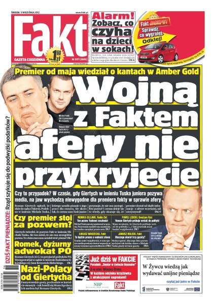 Czy premier od maja wiedział o kantach w Amber Gold; czy Rutkowski znów ucieknie od ślubu; ksiądz Zbigniew R., który molestował dwóch nastoletnich chłopców, został skazany na dwa lata więzienia; sprawdź co pije twoje dziecko; Monika Richardson straciła kolejną pracę; szokujące wyznanie Agnieszki Popielewicz; Waldemar Fornalik tak, jak obiecał, nie patrzy na metrykę piłkarza, tylko na jego aktualną formę. Dzięki temu w kadrze są piłkarze, którzy u Smudy nie mieliby szans; były bramkarz reprezentacji Polski przewiduje, że po kolejnych porażkach kadry w PZPN dojdzie do rewolucji; kibice w Gdańsku zobaczą z pewnością krwawą jatkę podczas 20. gali Konfrontacji Sztuk Walki.