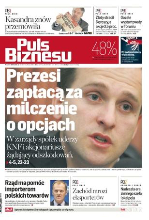 KNF chce się dobrać do skóry tym spółkom zawierającym toksyczne transakcje na opcje, które nie informowały o podjętym ryzyku, eksperci twierdzą, że zarządy spółek spekulujących opcjami mogą odpowiadać nawet na wniosek pojedynczych akcjonariuszy, Sanwil rozliczył toksyczne opcje częścią pieniędzy z emisji, AlcerolMittal wygrał z ZUS-em, ale nadal płaci, MF opracowało kontrowersyjny plan finansowego wspierania zagranicznych firm, które kupują w Polsce, IKEA ma wydać w Polsce 6 mld USD.