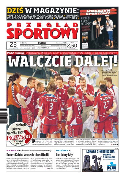 Pomimo porażki z Niemcami 23:30, polscy szczypiorniści nadal grają w mistrzostwach świata; czołowe kluby Ekstraklasy nie dokonały jeszcze żadnego spektakularnego transferu; wywiad z Grzegorzem Wesołowskim, trenerem ŁKS Łódź; losowanie 1/8 finału Ligi Mistrzów siatkarzy; starsza z sióstr Williams odpadał w drugiej rundzie Australian Open; Mateusz Kusznierewicz i Dominik Życki zastanawiają się nad swoją dalszą karierą; Robert Kubica jest zadowolony z nowego bolidu BMW Sauber.