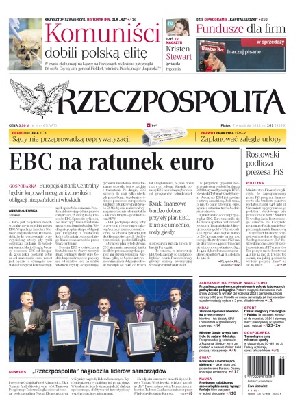 Europejski Bank Centralny będzie kupował nieograniczone ilości obligacji hiszpańskich i włoskich; czy plan PiS zmieni nas w drugą Grecję; bez magicznych rozwiązań, ale z nową wizją dla Ameryki – takie miało być przemówienie Baracka Obamy; wszystko wskazuje na to, że Federalny Trybunał Konstytucyjny nie zablokuje 12 września tego roku procesu ratowania euro; czy przebojem tego sezonu będzie „wszystkomający” sprzęt łączący funkcje kilku urządzeń w jednej obudowie; czy Tomasz Adamek wygra w sobotę z Travisem Walkerem; dziś meczem z Czarnogórą rozpoczynamy eliminacje do mundialu; dzisiaj na mieszkanie wydajemy nawet 100 tys. zł mniej.