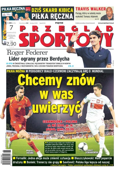Dzisiejszym meczem w Podgoricy rozpoczynamy eliminacje mistrzostw świata w Brazylii; w poprzednich eliminacjach Bułgarzy nie strzelili u siebie ani jednego gola – dziś w Sofii podejmują wicemistrzów Europy, którzy w tych samych eliminacjach stracili najmniej bramek ze wszystkich drużyn; po klęsce na EURO 2012 Pomarańczowi mają nowego-starego trenera i przebudowany zespół; od 10 do 16 września na Warmii i Mazurach rywalizować będą sportowcy powyżej 40 roku życia; najbliższy rywal Tomasza Adamka jest specjalistą od dziwnych porażek – czy w sobotni wieczór Travis Walker może pokonać naszego boksera; Roger Federer uległ w ćwierćfinale US Open Tomašowi Berdychowi; dziś ruszają rozgrywki Polskiej Ligi Hokejowej.