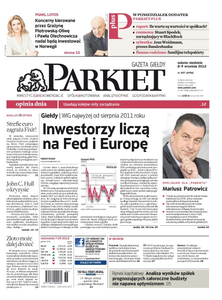 Koncerny kierowane przez Grażynę Piotrowską-Oliwę i Pawła Olechnowicza nadal będą inwestować w Norwegii; WIG najwyżej od sierpnia 2011 roku – inwestorzy liczą na Fed i Europę; upadają kolejne mity zarządzania; analiza wyników spółek prognozujących całoroczne budżety nie napawa optymizmem.