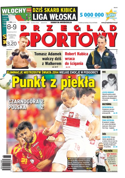 Polska – Czarnogóra 2:2 – gole, kartki, petardy, emocjonujący start eliminacji mundialu; Tomasz Adamek walczy dziś z Walkerem; Robert Kubica wraca do ścigania; odszedł wybitny polski pięściarz Leszek Drogosz, brązowy medalista igrzysk olimpijskich w Rzymie; dzisiejszym meczem z Albanią kończymy eliminacje do eurobasketu; Tomasz Gollob zapowiada bój o medal, mimo że traci do trzeciego w klasyfikacji Nickiego Pedersena 19 punktów.