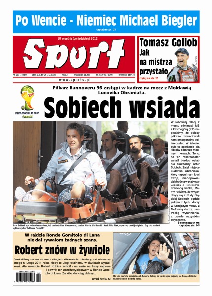 Piłkarz Hannoveru 96 zastąpi w kadrze na mecz z Mołdawią Ludovika Obraniaka; strzelając dwa gole Mołdawii, Frank Lampard wyprzedził Geoffa Hursta w klasyfikacji strzelców angielskiej drużyny narodowej wszech czasów; 51-letni Michael Biegler został wybrany na selekcjonera męskiej reprezentacji Polski – taką decyzję podjął w niedzielę zarząd Związku Piłki Ręcznej w Polsce; Gorzowianie remis w Zielonej Górze traktują jak zwycięstwo, a torunianie w Tarnowie nie stracili zbyt wiele; polscy koszykarze w świetnych nastrojach zakończyli eliminacje do EuroBasketu 2013 – wygrali wysoko z Albanią, a do tego znakomite wiadomości napłynęły z Belgii; dorobek Polaków na paraolimpiadzie w Londynie to: 36 medali – 14 złotych, 13 srebrnych, 9 brązowych – i 9. miejsce w klasyfikacji 75 krajów.