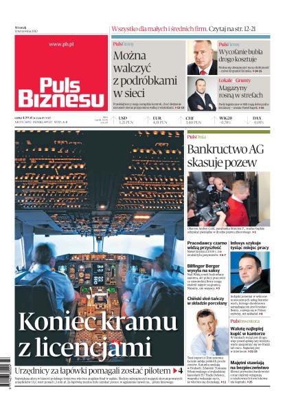 Jak walczyć z podróbkami w sieci; największa afera w historii polskiego lotnictwa wkrótce znajdzie finał w sądzie – śledczy zabezpieczyli majątek skorumpowanych urzędników ULC wart ponad 1,3 mln zł – za łapówkę można było uzyskać pomoc w egzaminie nawet na pilota liniowego; dlaczego ofiarom Amber Gold, parabanku Marcina P., trudno będzie odzyskać pieniądze w drodze pozwu zbiorowego; nad Wisłą rynek budowlany zamiera, ale polscy pracownicy niemieckiej firmy mogą znaleźć zajęcie za granicą; indyjski potentat w sektorze nowoczesnych usług biznesowych, którego dyrektorem zarządzającym jest Krystian