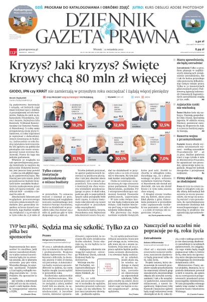 Tylko 12 proc. firm planuje w najbliższych miesiącach zwiększenie zatrudnienia; błędne koło się nakręca – hamują gospodarki Chin i Korei oraz spowalnia Japonia; szara strefa wyrobów tytoniowych wynosi – według szacunków Pracodawców RP – aż 21 proc.; aż trzy na cztery zakłady w ubiegłym roku padły ofiarą defraudacji lub oszustw ze strony pracowników; dlaczego choć od 1 stycznia wiek emerytalny zostanie wydłużony, nauczyciele akademiccy będą pracować tylko do 65. roku życia; czy w 2013 r. zabraknie pieniędzy na szkolenia dla sędziów i prokuratorów; reprezentacja bez sponsorów – to możliwe, jeśli mecze narodowej drużyny w piłce nożnej transmitowane będą nie na otwartej antenie, ale w płatnym systemie pay-per-view; GIODO, IPN czy KRRiT nie zamierzają w przyszłym roku oszczędzać i żądają więcej pieniędzy.
