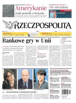 Czy oddamy autonomię nad naszymi bankami nadzorowi we Frankfurcie; Joanna Kluzik-Rostkowska ma „uwrażliwić” resort finansów na sprawy społeczne i osłabić pozycję PSL w rządzie; dwaj oficerowie U.S. Army już w maju 1943 roku znaleźli się w Katyniu – wysłali do rządu szyfrogramy, w których poinformowali, że za zbrodnią stoi NKWD; uczelnie przekonały ministerstwo, że wprowadzone ograniczenia liczby studentów są nierealne; umacnia się pozycja syna prezydenta Wiktora Janukowycza – na razie tylko w biznesie; Naukowa Fundacja Polpharmy ma już pierwszy jubileusz dziesięciolecia za sobą; szpiegowskie oprogramowanie stworzone w celu łapania przestępców jest używane do namierzania przeciwników politycznych; Serena Williams wygrała w Nowym Jorku czwarty raz.