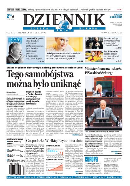 Samobójstwa Pazika można było uniknąć, ale służba więzienna zlekceważyła notatkę pracownika aresztu; ministerstwo finansów oskarża PiS o słabość złotego; recesja daje sie we znaki Wielkiej Brytanii; wciąż są wątpliwości co do przyczyny zeszłorocznej katastrofy CASA; nie będzie drogii przez dolinę Rospudy; Barack Obama zgodnie z obietnicami popiera aborcję. Dodatki: The Wall Street Journal, Warszawa, Magazyn Dziennika, Europa, Podróże.