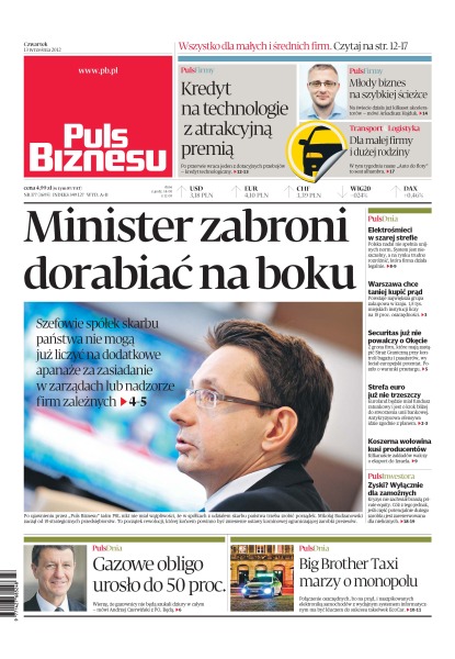 Po przerwie wraca jeden z dotacyjnych przebojów – kredyt technologiczny; „auto do floty” – Seat Alhambra; dlaczego szefowie spółek skarbu państwa nie mogą już liczyć na dodatkowe apanaże za zasiadanie w zarządach lub nadzorze firm zależnych; powstaje największa grupa zakupowa w kraju. 1,5 tys. miejskich instytucji liczy na 15 proc. oszczędności; z grona firm, które mają zastąpić Straż Graniczną przy kontroli bagażu i pasażerów, wyleciał europejski potentat; Euroland będzie miał fundusz ratunkowy i jest o krok bliżej do stworzenia unii bankowej; kilkanaście zakładów walczy o eksport do Izraela; czy kryzys nie zachwiał branżą private equity; gazowe obligo urosło do 50 proc.