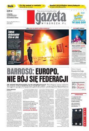 Jak zmienić Unię Europejską, by nie zatopił jej kryzys; dlaczego nikt nie detronizuje Platformy, gdy jej rząd jest coraz gorzej oceniany; Marcin P. pozostanie w areszcie śledczym – prokuratura wszczyna kolejne śledztwo; w ataku na konsulat w Bengazi zginął amerykański ambasador – napastników rozwścieczył nakręcony przez budowlańca z Kalifornii amatorski film obrażający proroka Mahometa; w największej w historii regionu półtoramilionowej demonstracji w Barcelonie Katalończycy zażądali niepodległości; w Polsce przeprowadzono już około tysiąca badań zarodków przed implantacją; jakie przywileje utracą, a jakie utrzymają mundurowi, sędziowie, rolnicy, prokuratorzy i górnicy; rząd zmienił zasady przyznawania rent; trybunał konstytucyjny zgodził się, by Niemcy wsparły fundusz ratunkowy euro, a Komisja Europejska proponuje wspólny nadzór nad bankami.