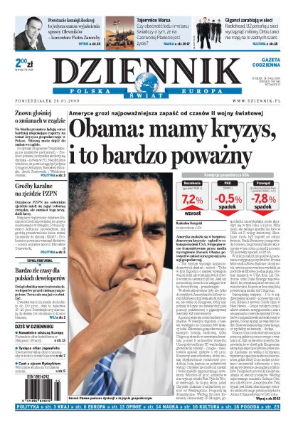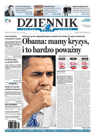 Ameryce grozi najpoważniejszy kryzys od czasów II wojny światowej; czy niepokojące raporty o sytuacji gospodarczej kraju zakończą się rekonstrukcją rządu; zjazd PZPN zakończył się farsą; ojciec Rydzyk uruchamia studia przez internet; internetowy sklep oszukał kilka tysięcy osób; potężny huragan przetoczył się przez południową Europę; nowatorskie formy sprzedaży muzyki zdominowały tegoroczne targi MIDEM w Cannes. Dodatki: The Wall Street Journal Polska, Warszawa, Praca.