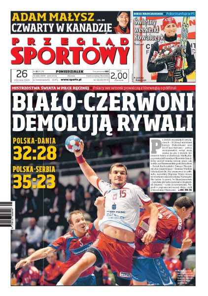 We wtorek Polacy będą walczyć z Norwegią o półfinał w MŚ w piłce ręcznej; działaczom PZPN udało się zawiesić Henryka Klocka; wywiad z Ryszardem Adamusem; Eto'o, Messi, Henry - magiczne trio Barcelony; Descarga walczy o miejsce w podstawowym składzie Legii Warszawa; piłkarze Kolejorza szukają pomysłów na urozmaicenie treningów; Justyna Kowalczyk wygrała w Otepää; Adam Małysz wraca do stabilnej formy; Matkowski i Fyrstenberg awansowali do ćwierćfinału Wielkiego Szlemu; reportaż o Polskim Związku Akrobatyki Sportowej.