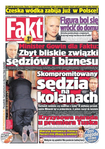 Skompromitowany sędzia modli się o łaskę – nagrany prezes gdańskiego sądu był wczoraj w kościele; po naradzie z ministrami premier tłumaczył się z afery z sędzią; kto leży w grobie Anny Walentynowicz; jej mąż wciąż ma klucze do willi – Kasia Figura ukrywa się przed nim u znajomych; jak ło wczasuje w Kołobrzegu; Alicja Bachleda-Curuś martwi się o swojego synka; mimo przewagi dwóch zawodników mistrz Polski nie pokonał Górali; mecz z Anglią jest dla PZPN i firmy SportFive kolejną okazją do tego, by zarobić grube miliony.